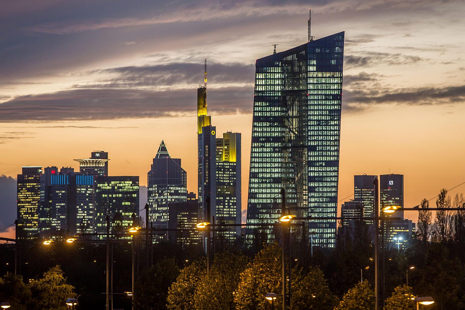 The European Central Bank illuminating the skyline of Frankfurt, Germany.