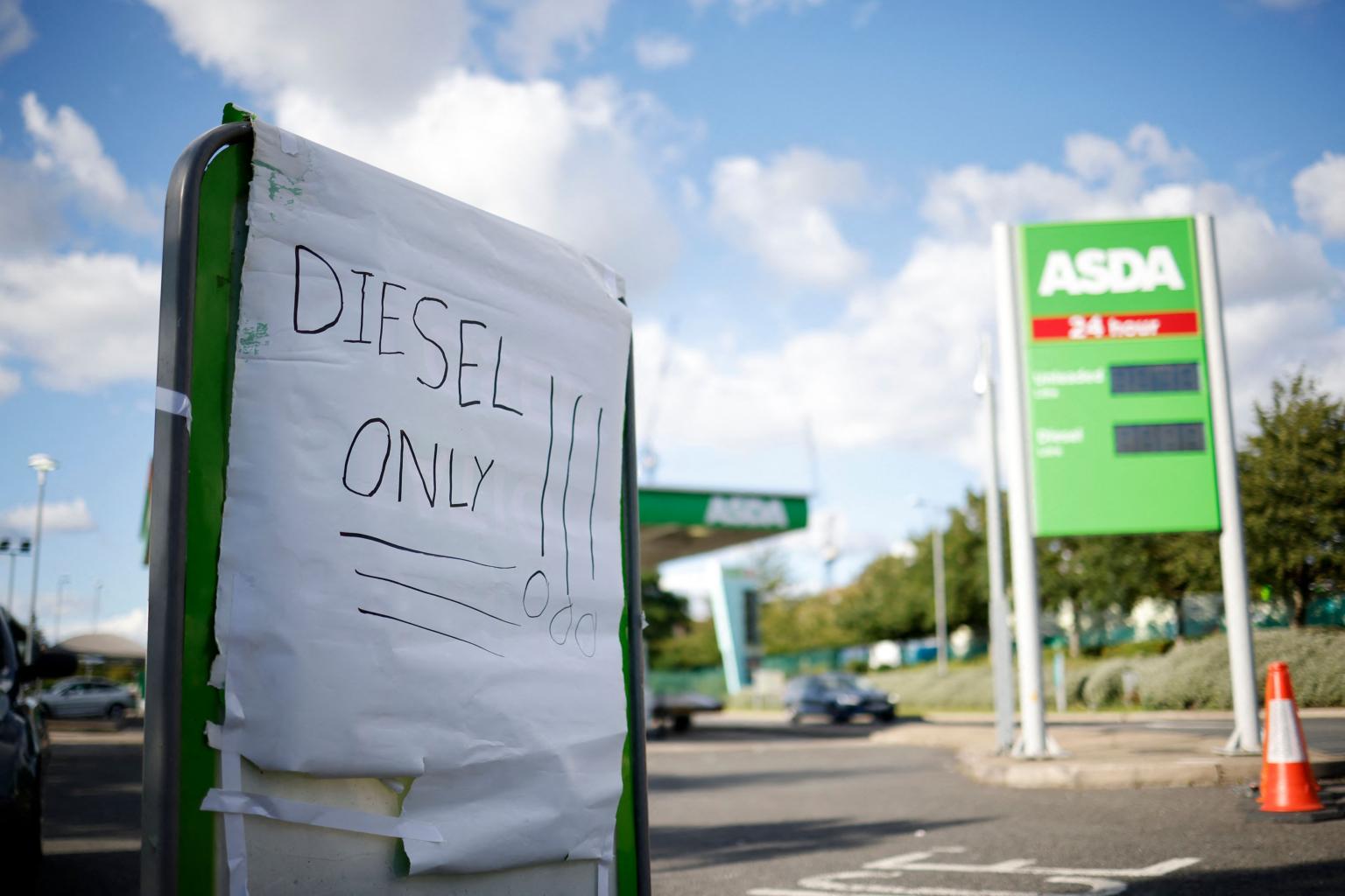 A sign is pictured at the entrance to a petrol station at an ASDA supermarket store in London on Sept 29, 2021.