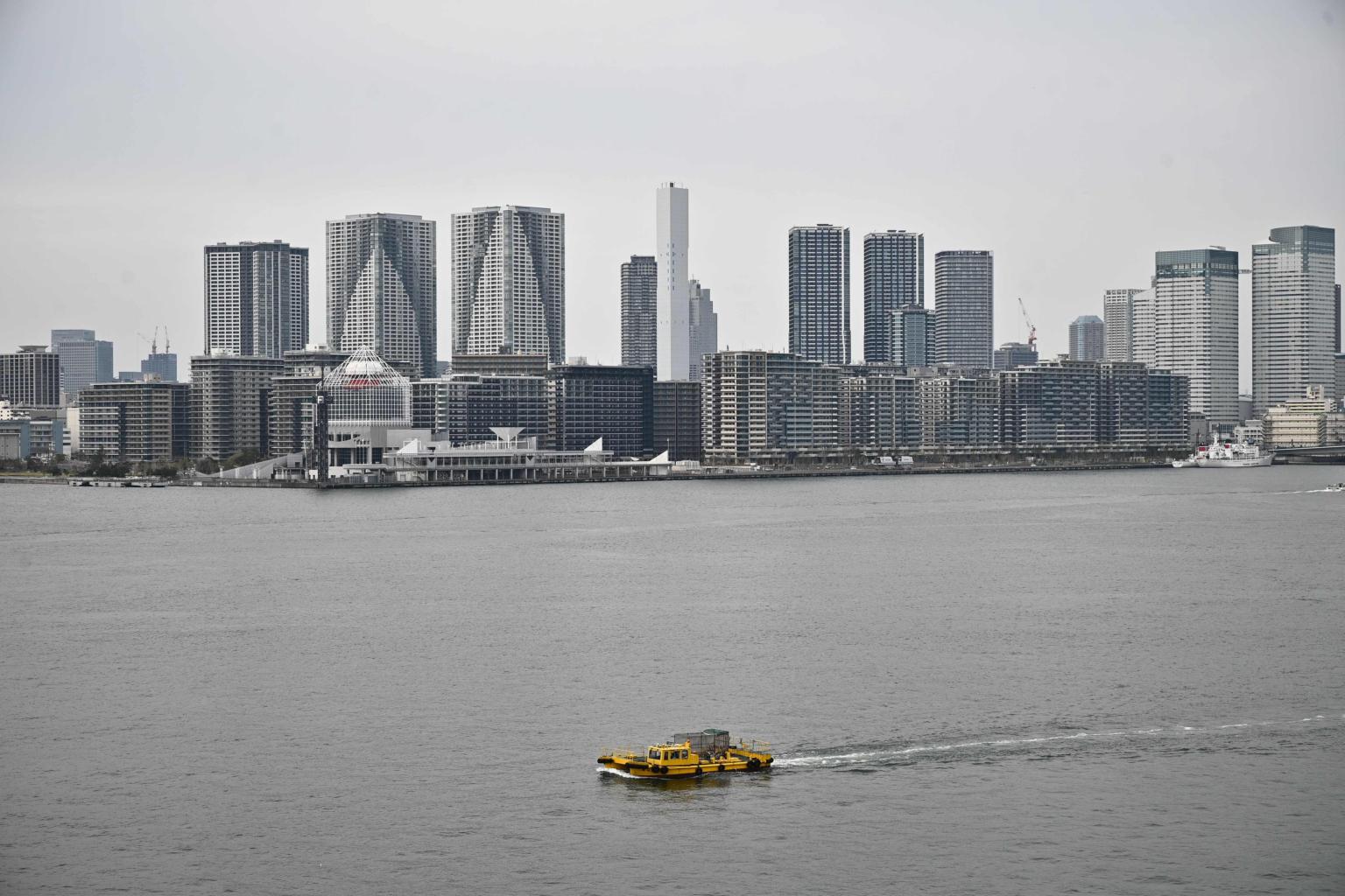 A boat sails through the Tokyo bay before the city skyline on April 7, 2020.