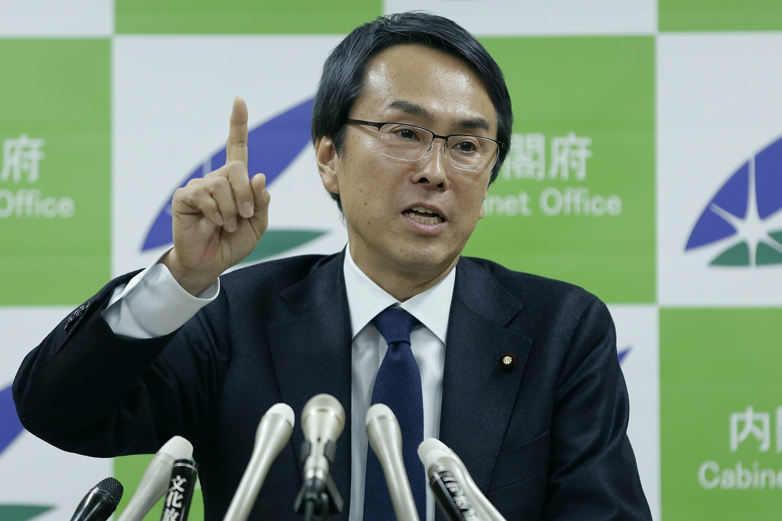 Nobuteru Ishihara, Japan's new economy minister, gestures as he speaks during a news conference in Tokyo.