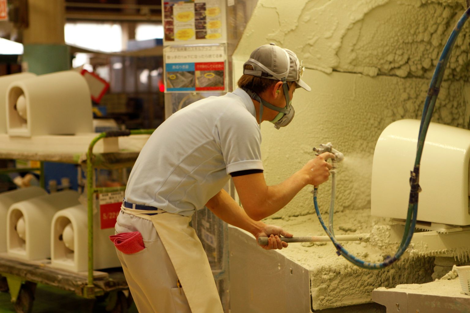 A worker sprays glaze onto a toilet at a Toto toilet factory in Kitakyushu, Japan, on Feb 6, 2020.