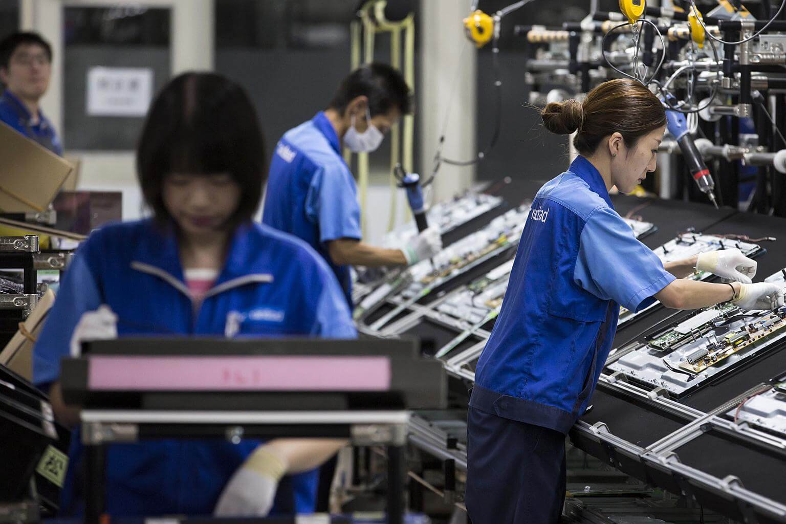 Workers assembling Panasonic Corp. Viera 4K LCD televisions on the production line of the company's Manufacturing Innovation Center in Utsunomiya, Japan, on Sept 21, 2016.
