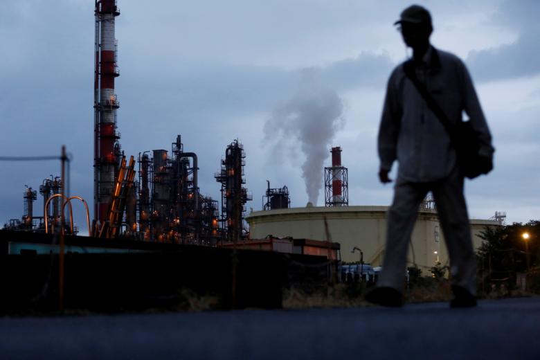 A man walks past a factory at the Keihin industrial zone in Kawasaki, Japan.