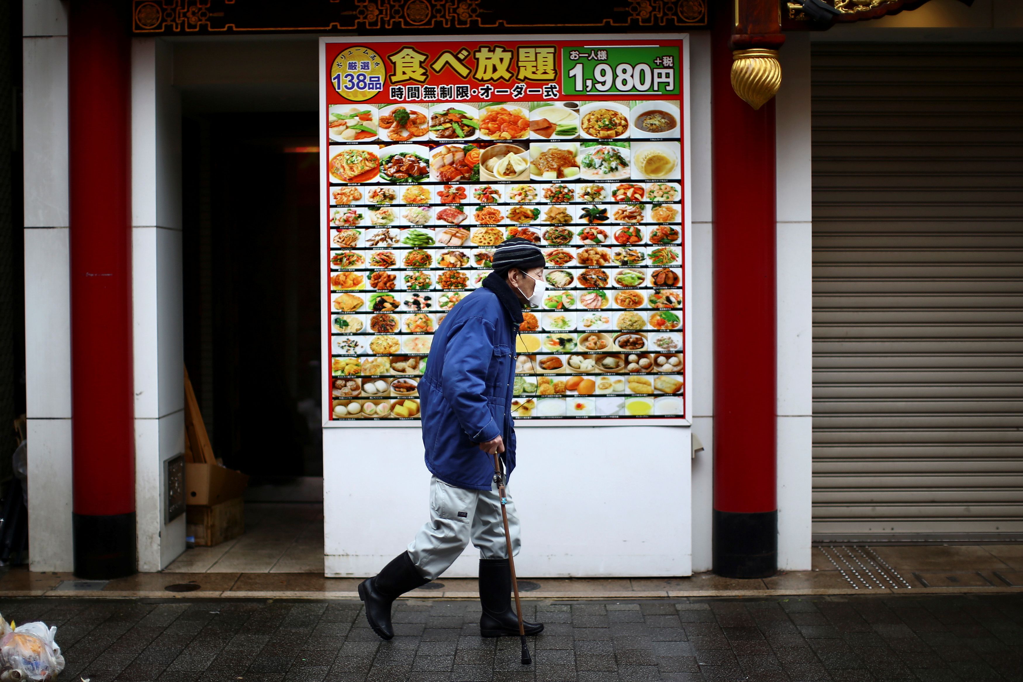 A man, wearing a protective mask following an outbreak of the coronavirus, walks on an almost empty street in Yokohama's Chinatown, south of Tokyo, on March 10, 2020.