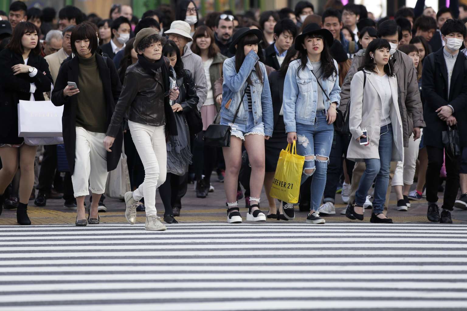 Pedestrians cross an intersection in the Shibuya district of Tokyo, Japan.