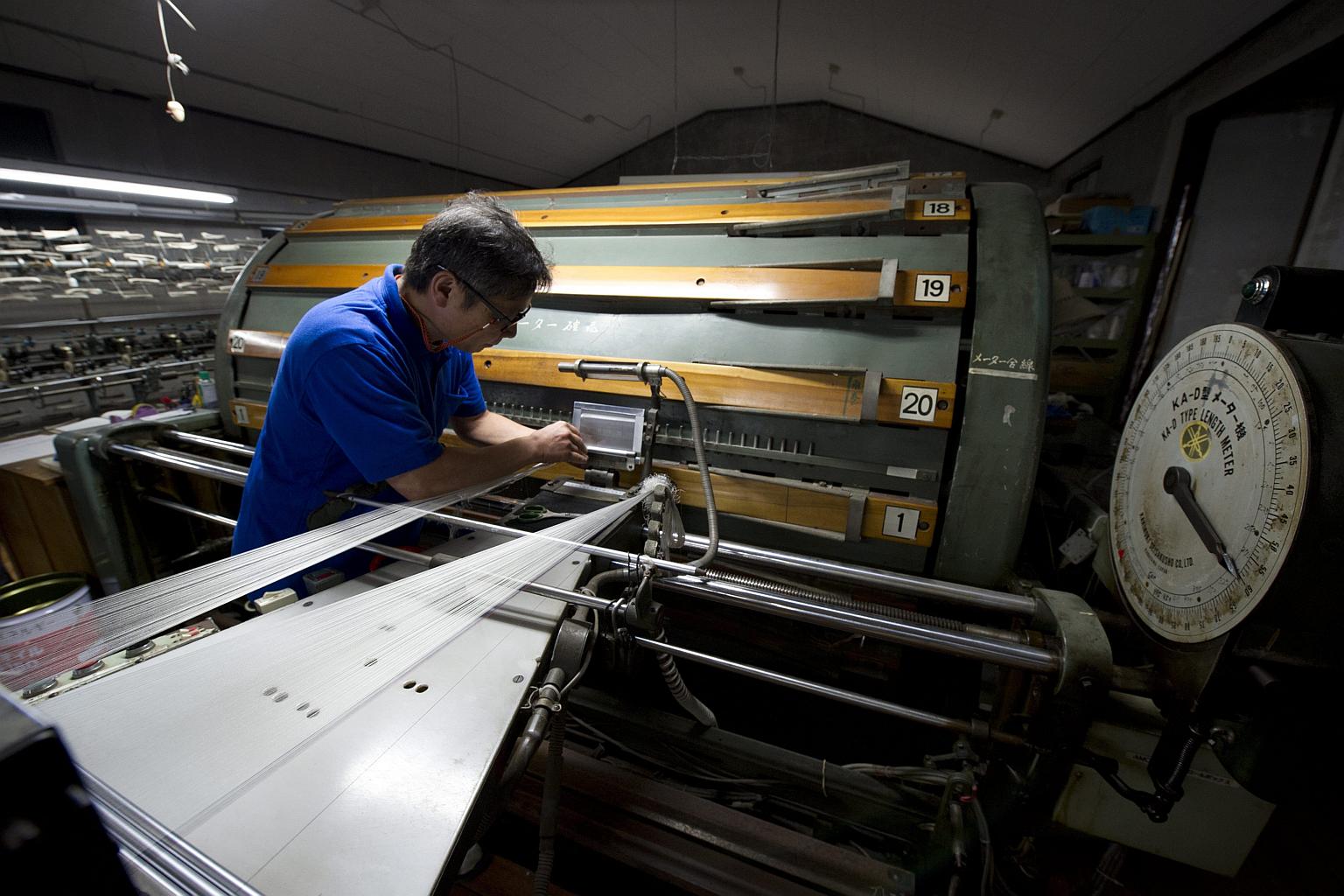 A factory worker inspects the quality of material on a weaving machine at the Gen Maeda silk weaving factory in Fujiyoshida city, Japan on Aug 26, 2015.