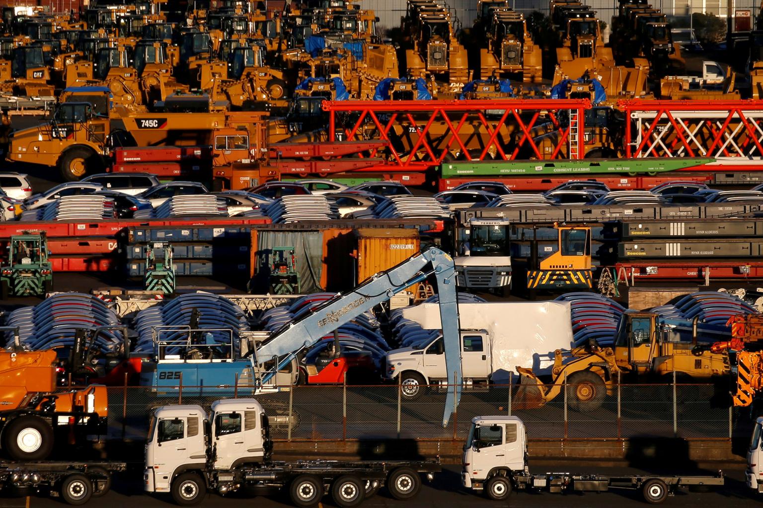 Newly manufactured vehicles await export at a port in Yokohama, Japan.