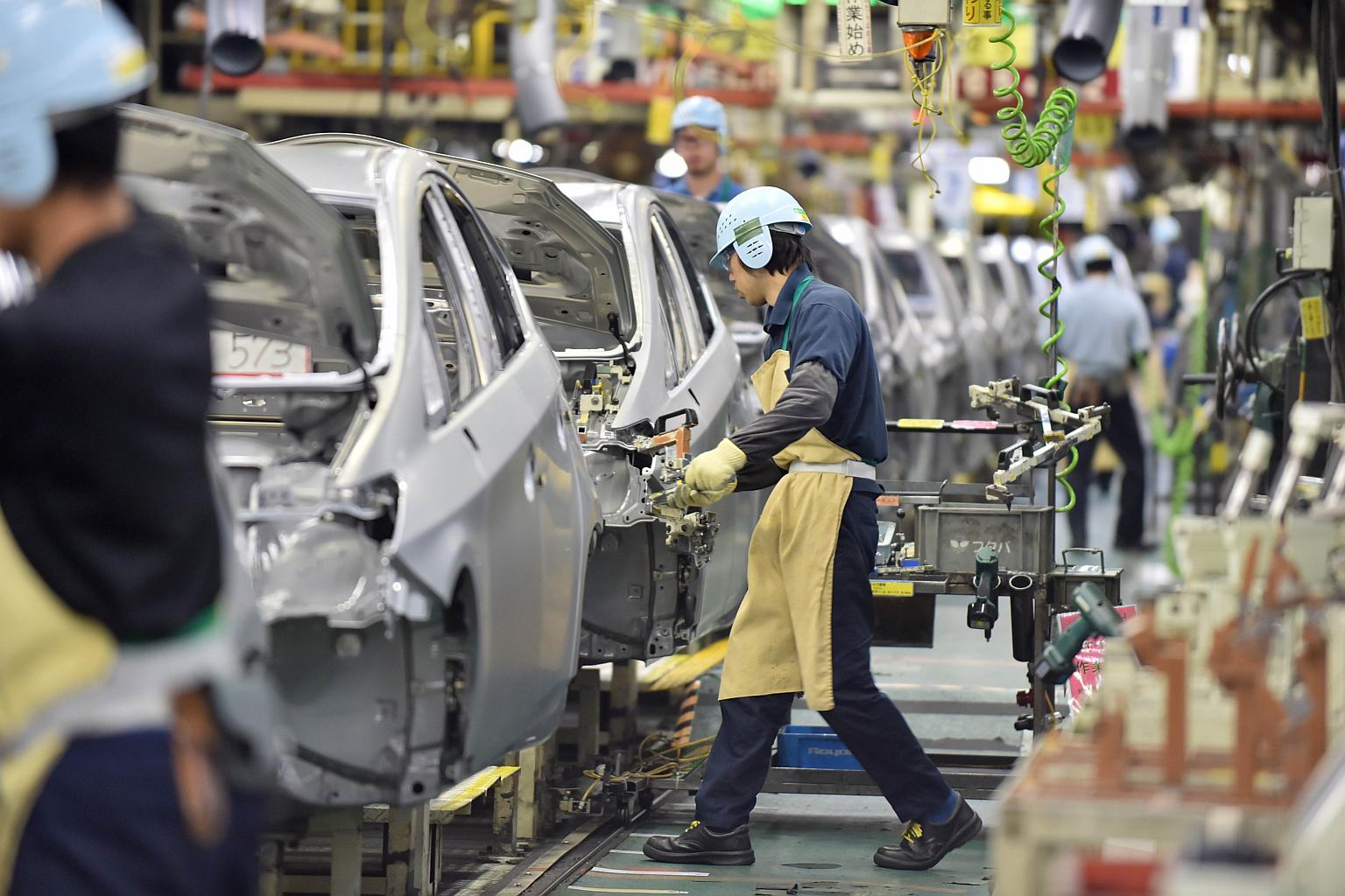 This file picture taken on Dec 4, 2014 shows an assembly line for Japanese auto giant Toyota Motor's hybrid vehicle Prius at the company's plant in Toyota in Aichi prefecture, central Japan.