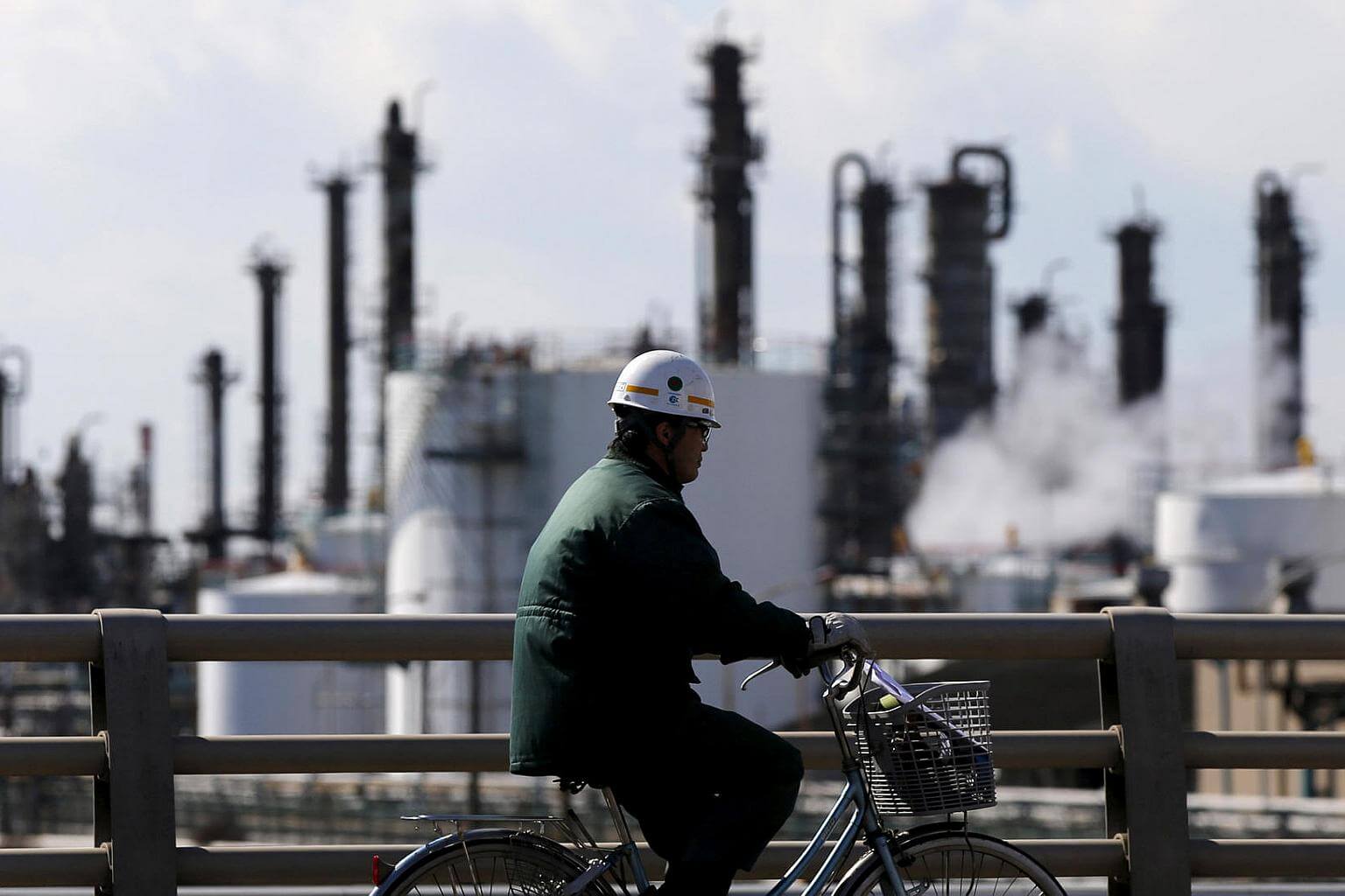 A worker cycles near a factory at the Keihin industrial zone in Kawasaki, Japan.
