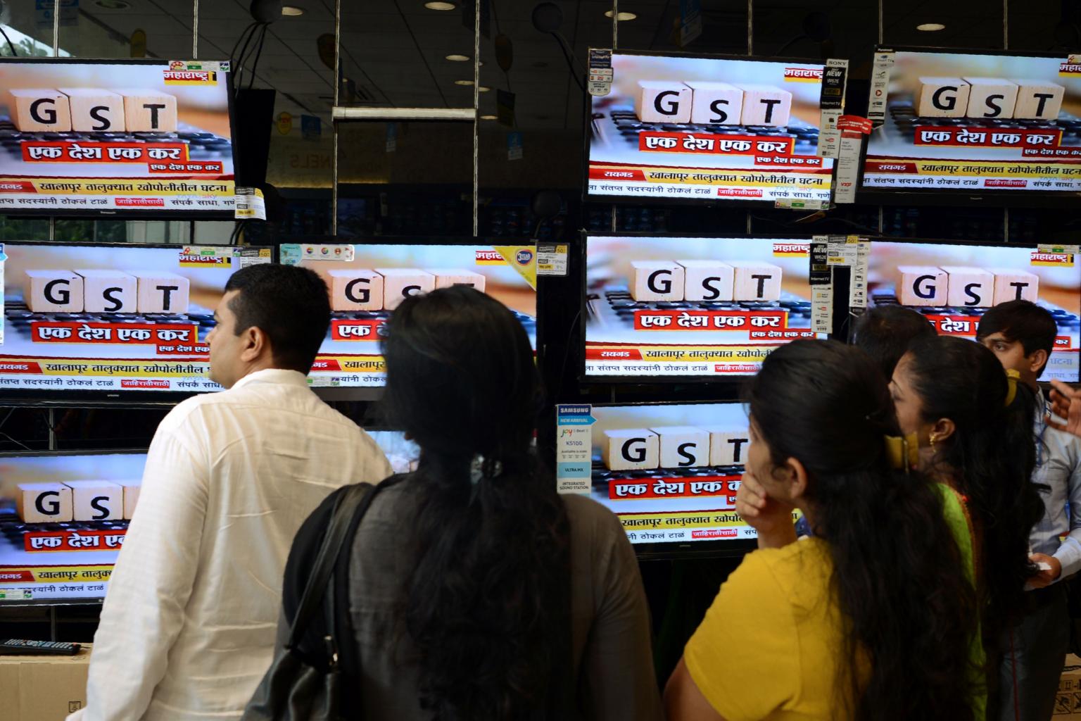 Indians look at televisions displaying news on the new Goods and Services Tax (GST) regime at an electronic appliances showroom in Mumbai.