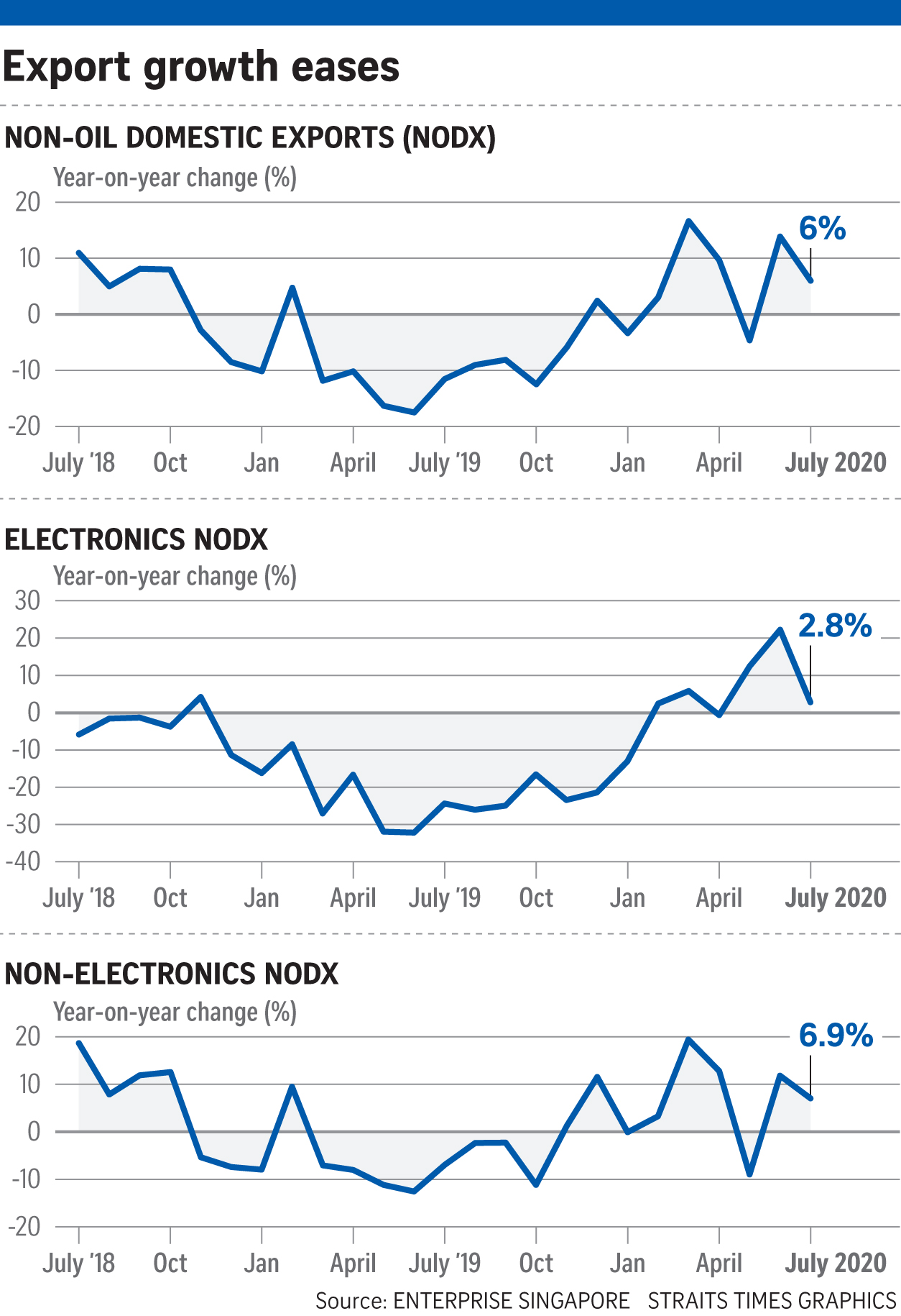Nodx rose 6 per cent year on year last month after a revised 13.9 per cent expansion in June and a 4.6 per cent drop in May, Enterprise Singapore (ESG) said yesterday.