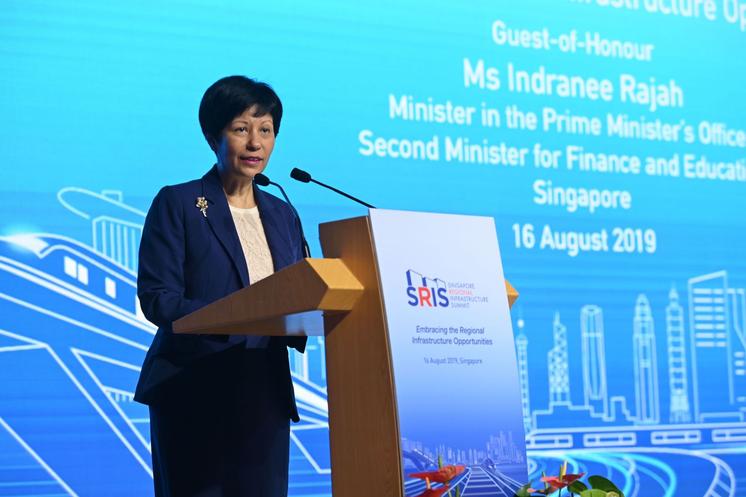 Minister in the Prime Minister's Office Indranee Rajah during her keynote speech at the Singapore Regional Infrastructure Summit on Aug 16, 2019. PHOTO: SINGAPORE BUSINESS FEDERATION