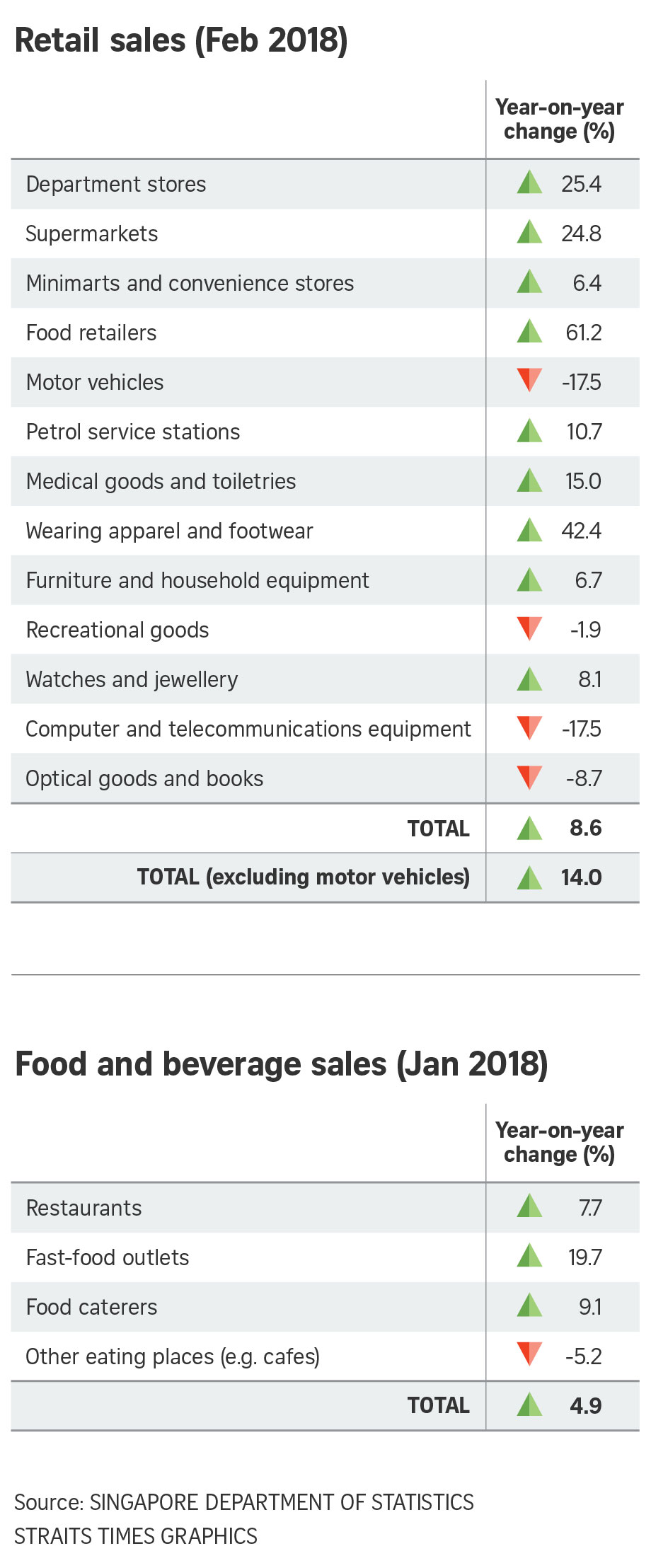 Chinese New Year was celebrated in February this year but in January last year. Coinciding with this year's festive season, retail sales of food retailers, apparel and footwear, department stores, and supermarkets and hypermarkets saw significant growth of between 24.8 per cent and 61.2 per cent compared to February 2017.