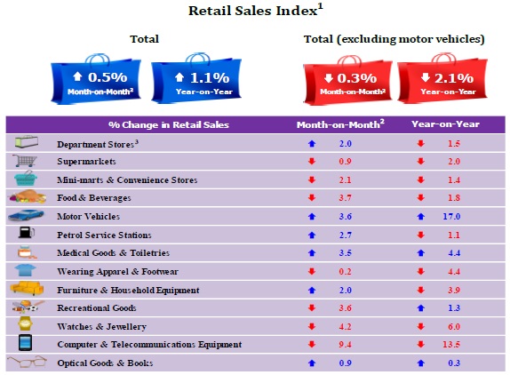 SINGAPORE - Retail sales in Singapore edged up 1.1 per cent in November from the previous year, according to figures released by the Department of Statistics (Singstat) on Friday (Jan 13).