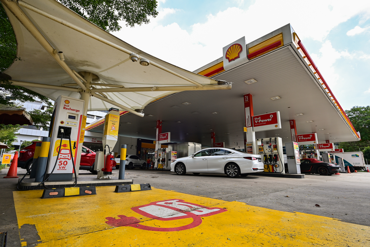 An electric vehicle (EV) rapid charging point (left) at Shell’s solar-powered service station in Paya Lebar Road.