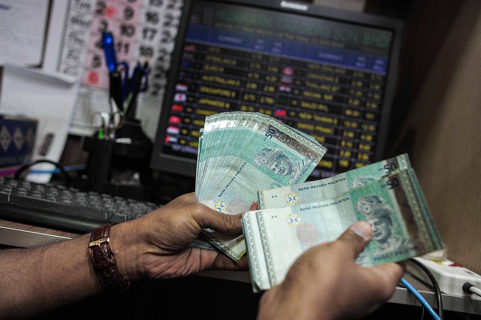 A money changer counts Malaysian ringgit banknotes for customers in Kuala Lumpur on June 11, 2015.