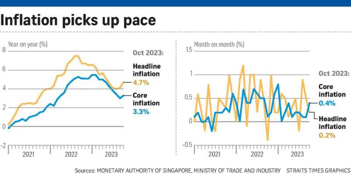 Official data on Nov 23 showed that core inflation, which excludes private transport and accommodation costs to better reflect the expenses of Singapore households, stood at 3.3 per cent year on year in October.