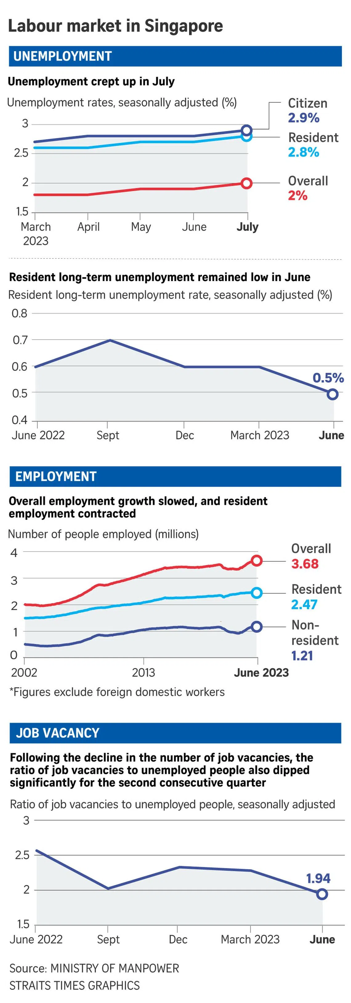 SINGAPORE – In the latest signs that Singapore’s labour market is cooling, unemployment crept up in July, and the demand for workers dropped again in the second quarter of 2023.