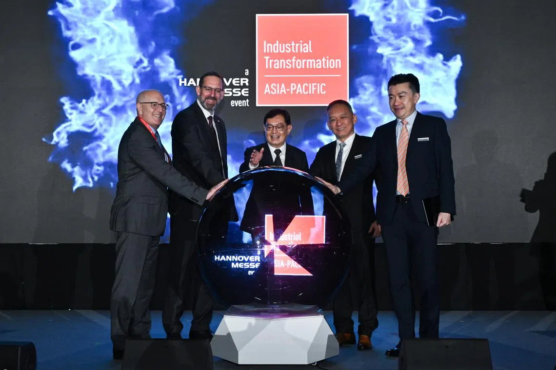 (From left) Deputy Chief of Mission (DCM) German Embassy Singapore Christoph Hallier, Deutsche Messe senior vice-president Arno Reich, Deputy Prime of Singapore Heng Swee Keat, Constellar group CEO Chua Wee Phong, Constellar markets chief executive Paul Lee launching Industrial Transformation Asia-Pacific 2024 at the Singapore Expo on Oct 14.