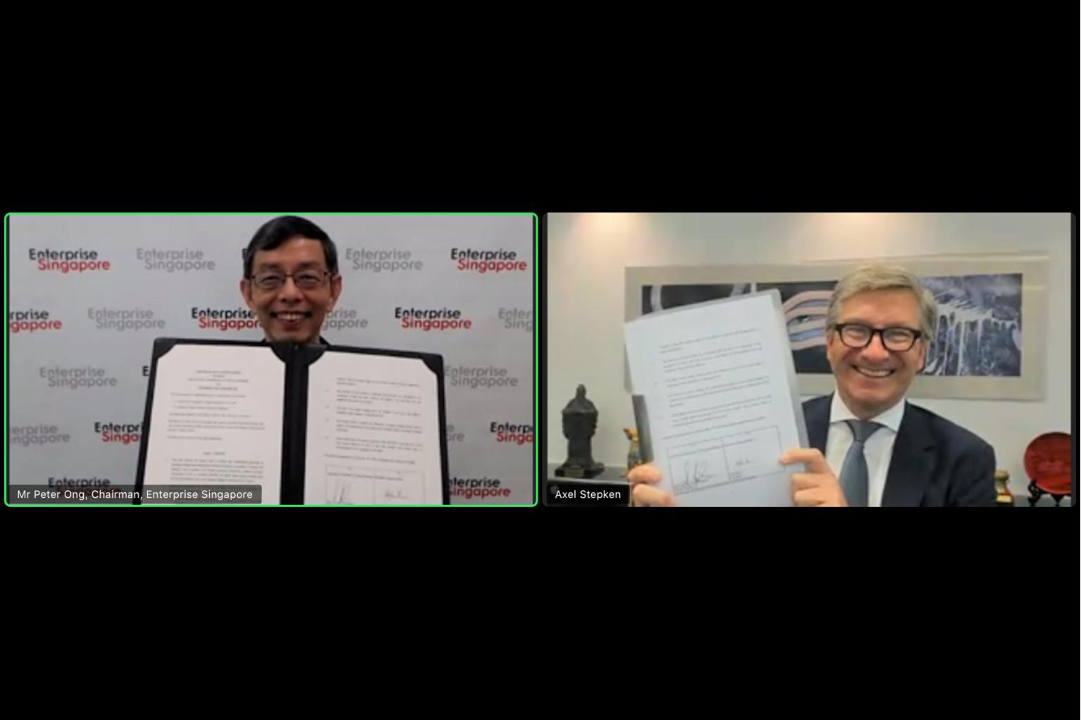 The partnership was signed by Enterprise Singapore chairman Peter Ong and Germany Singapore Business Forum Connect co-chair Axel Stepken.