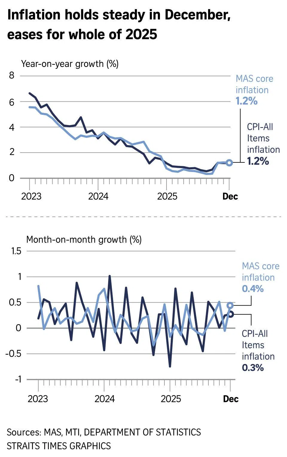 MAS and MTI did not reiterate their 2026 forecast for both measures to come in between 0.5 per cent and 1.5 per cent. Instead, in an indication that official forecasts might be raised, they said 2026 forecasts for both gauges will be updated in the upcoming monetary policy statement on Jan 29.