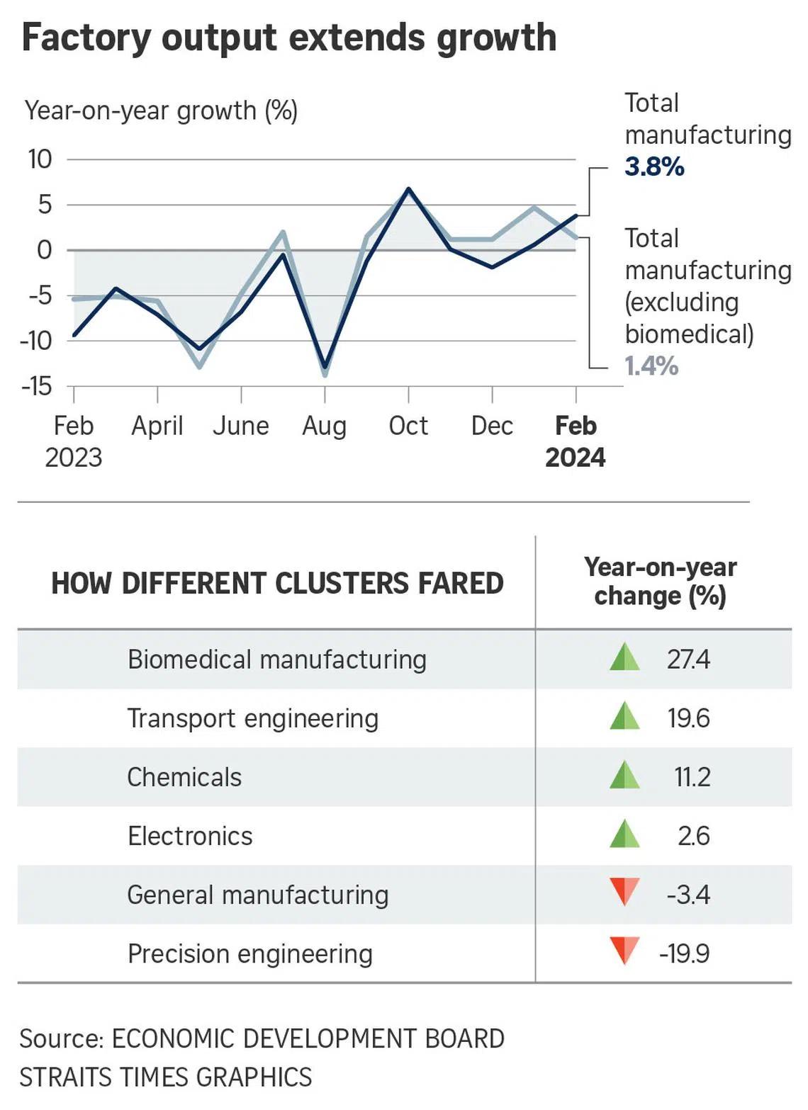SINGAPORE - Singapore’s factory output extended its expansion in February, growing 3.8 per cent year on year and beating analysts’ expectations.