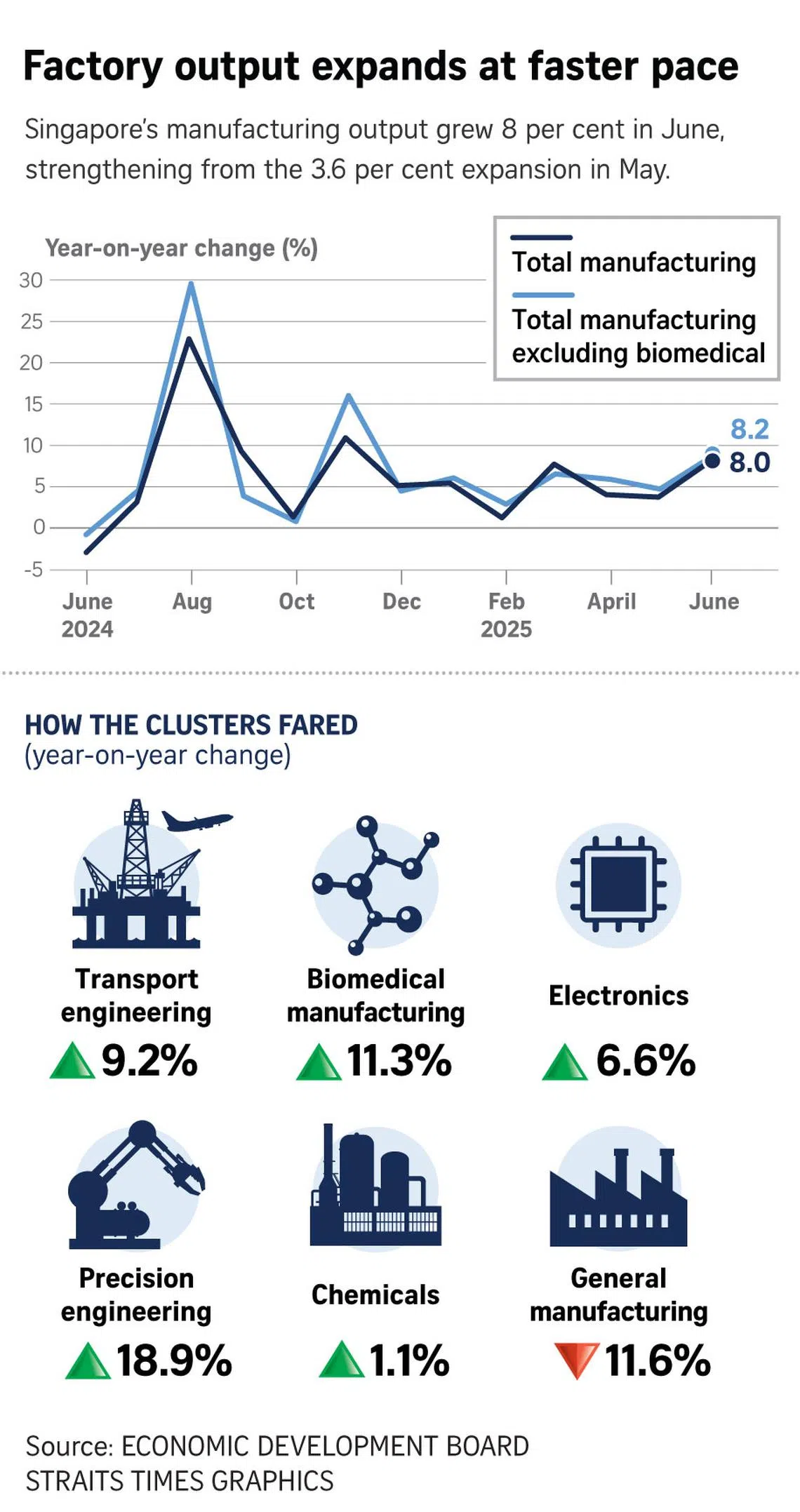 SINGAPORE – Singapore’s manufacturing output picked up pace in June, topping forecasts, but production is expected to slow in the second half of 2025 as US tariffs kick in.