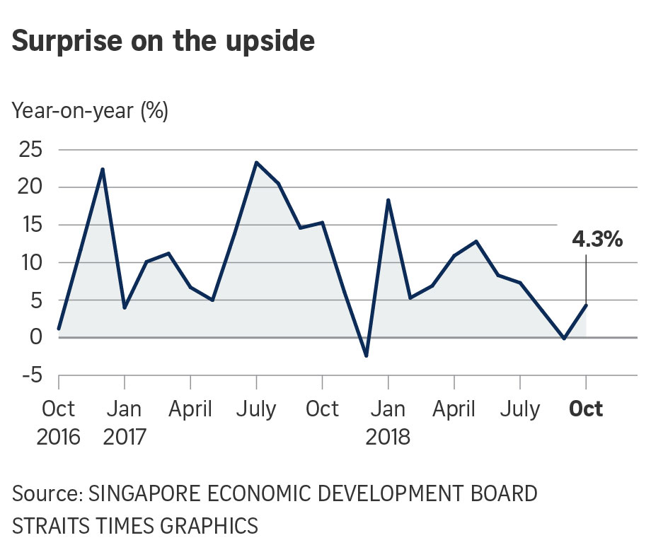 SINGAPORE - Singapore's manufacturing output grew 4.3 per cent year on year in October, more than rebounding from September's 0.1 per cent dip and exceeding economists' expectations of 2.6 per cent growth.