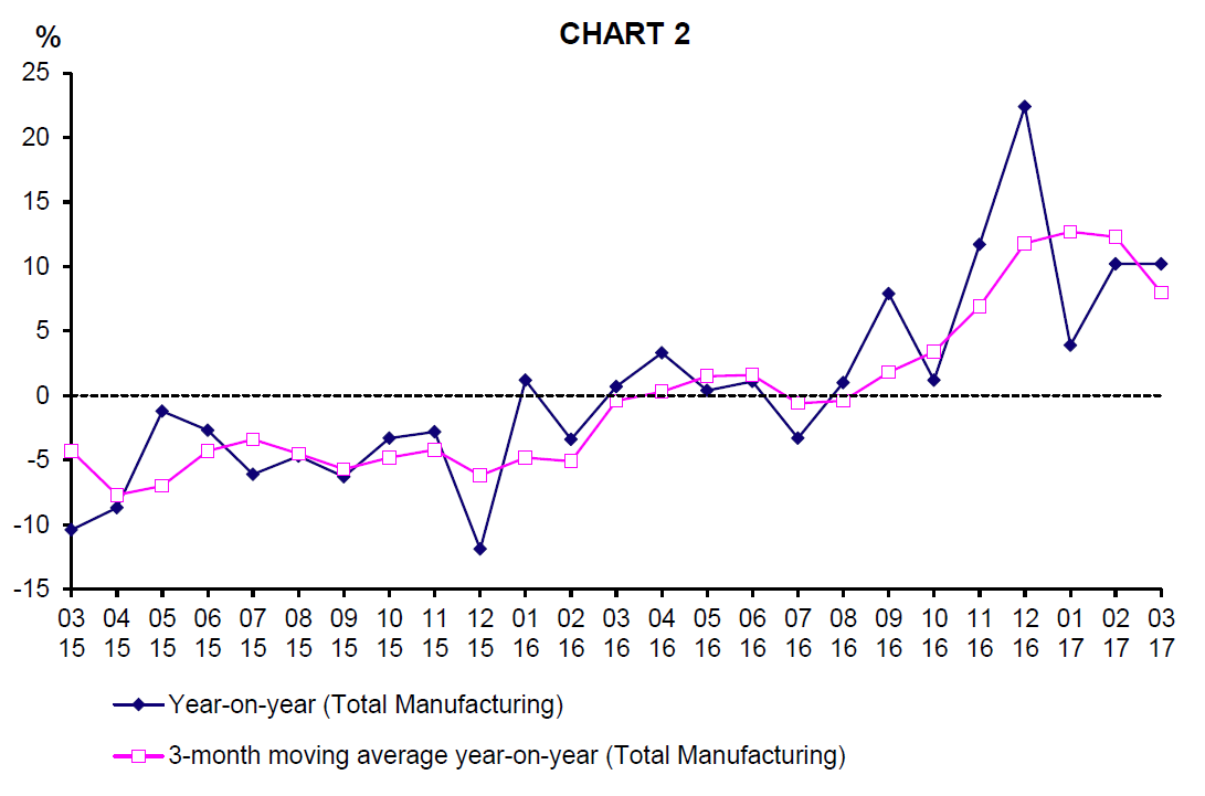 Electronics output - which accounts for over a fifth of total manufacturing - increased 37.7 per cent in March compared to the same month last year, with most of the credit going to the semiconductors segment which boasted growth of 54.6 per cent.