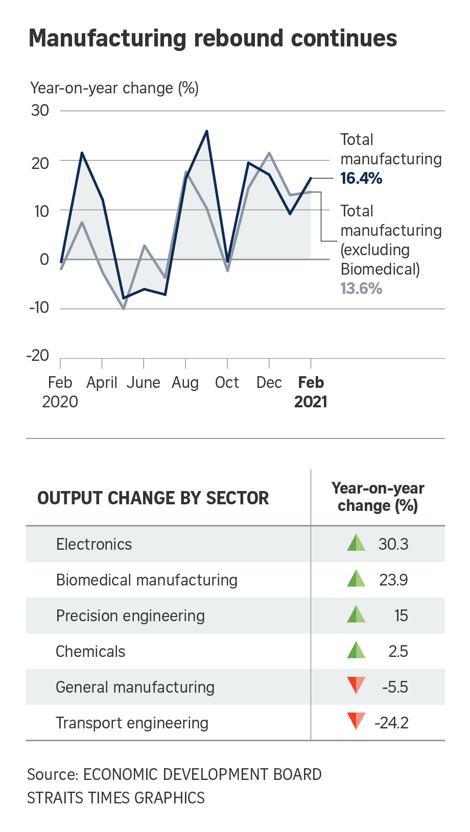 Excluding biomedical manufacturing, February production expanded 13.6 per cent year on year.