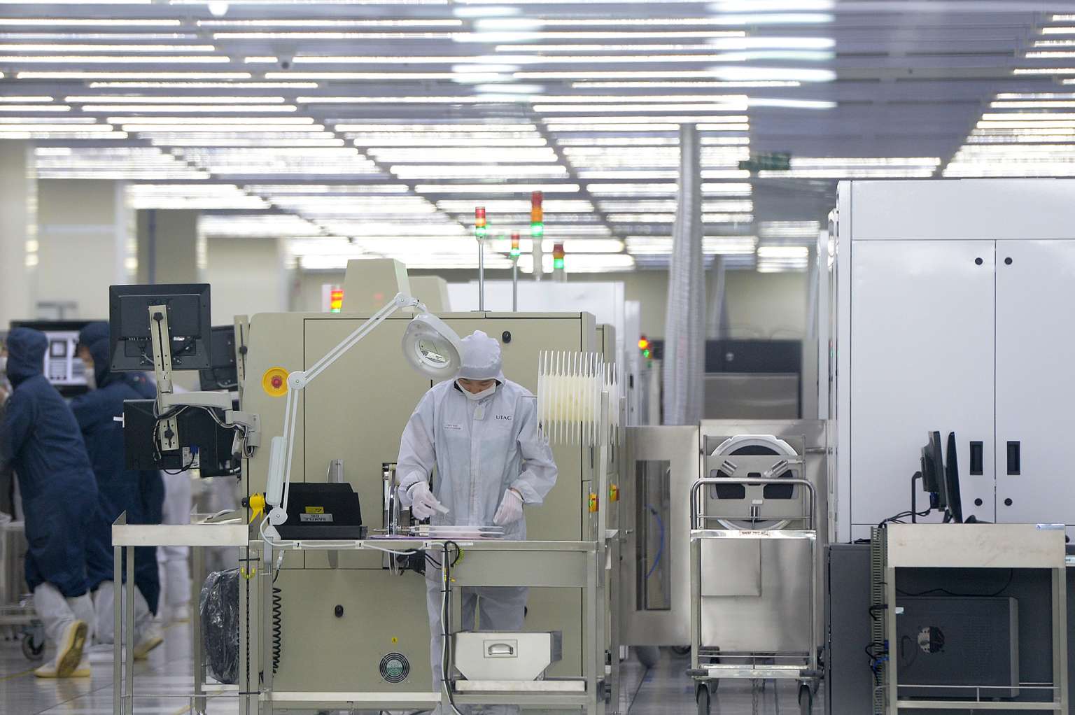Employees at work in a United Test and Assembly Center (UTAC) Group semiconductor facility in Singapore.