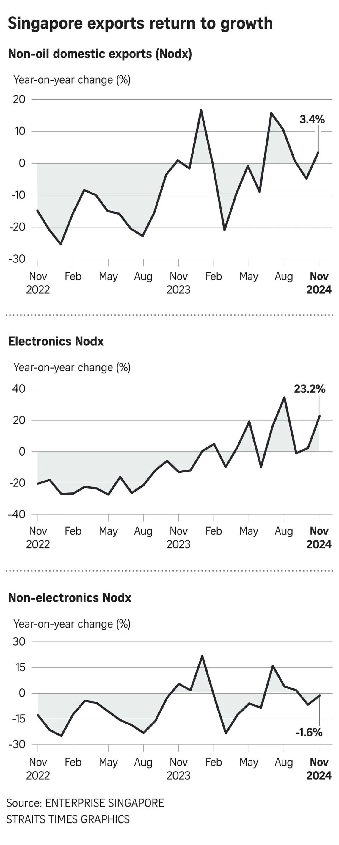 Non-oil domestic exports (Nodx) grew 3.4 per cent from a year ago, reversing a revised 4.7 per cent drop in October, according to figures released by trade agency Enterprise Singapore (EnterpriseSG) on Dec 17.