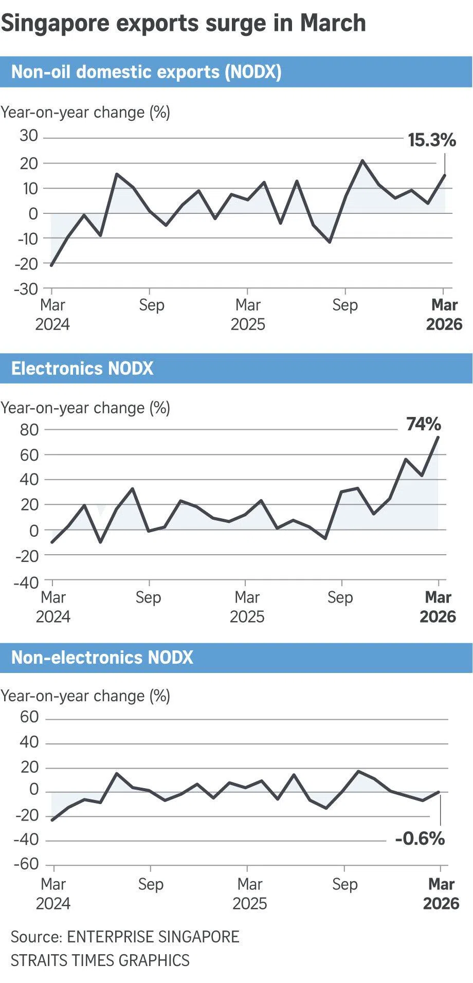 SINGAPORE - Singapore’s key exports accelerated in March as electronic shipments jumped on the back of strong artificial intelligence demand.