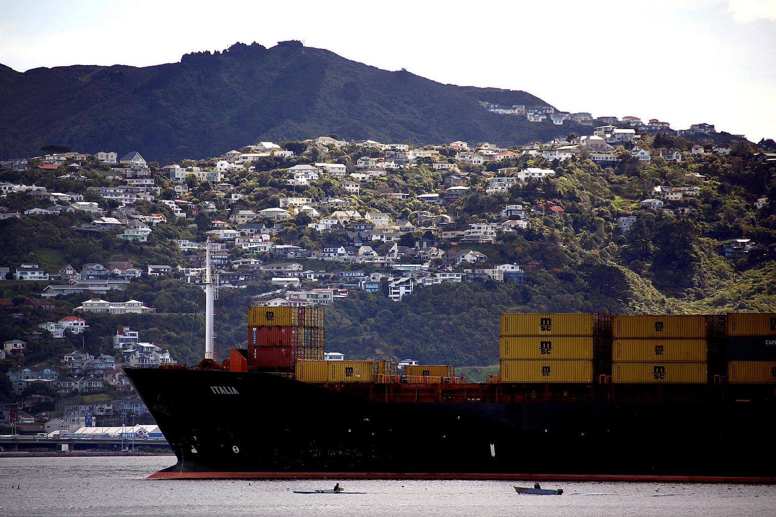 A container ship sails into Oriental Bay in the New Zealand capital of Wellington.