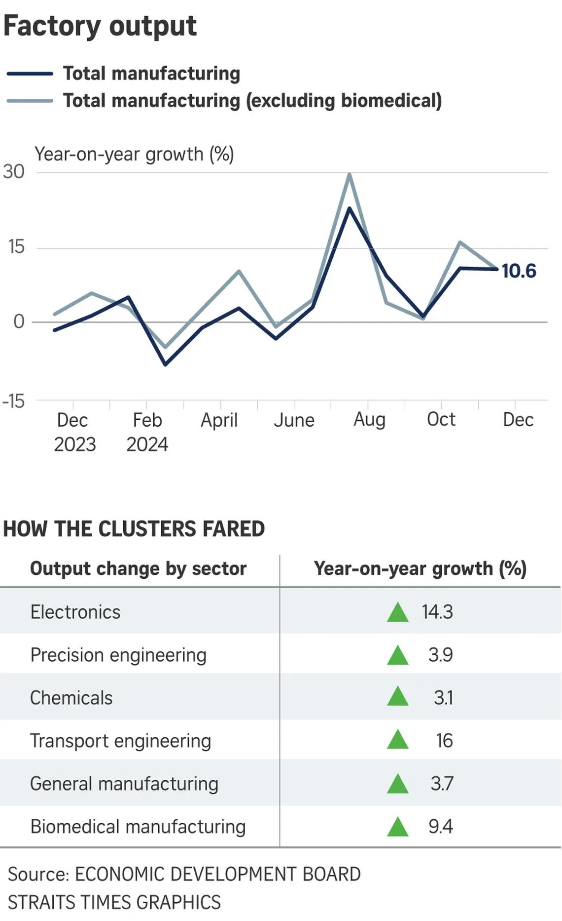 Excluding the more volatile biomedical industry, output also increased 10.6 per cent, according to data from the Economic Development Board on Jan 24.