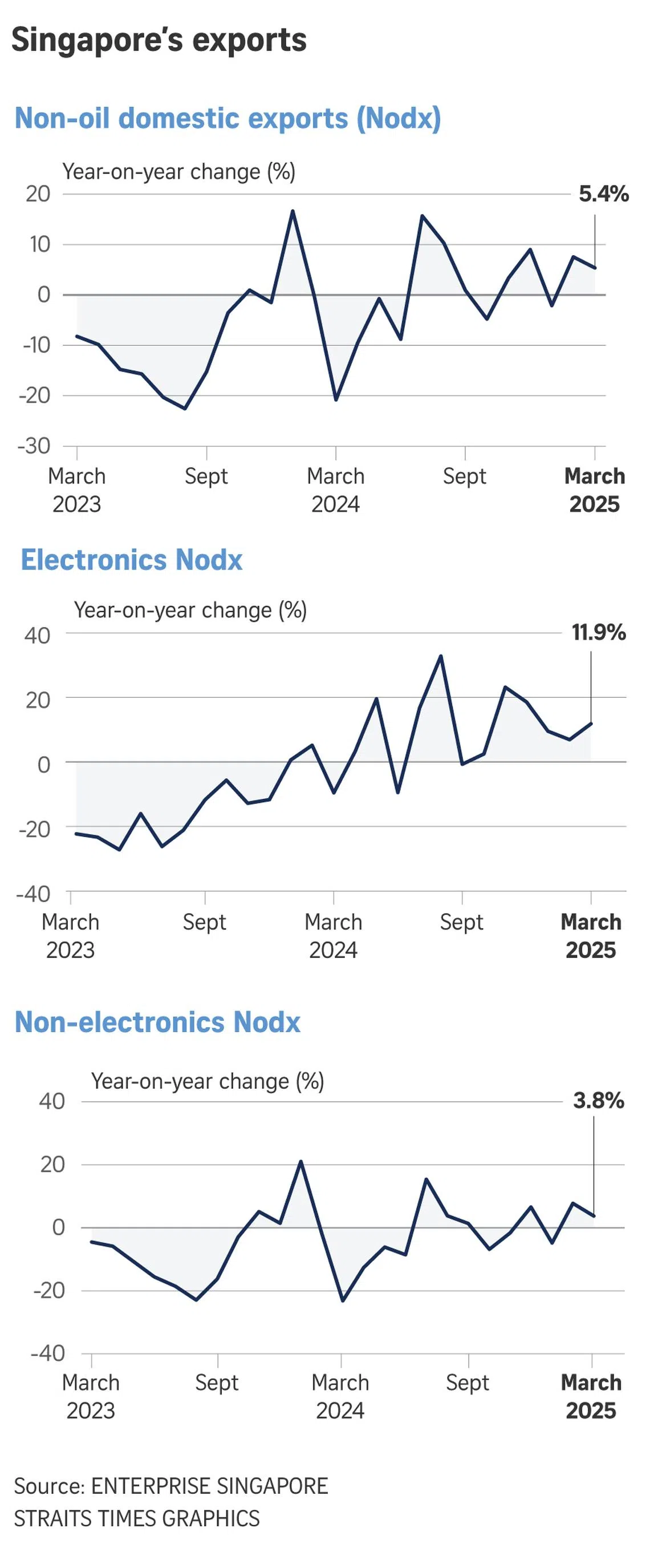 Enterprise Singapore, which released the latest March data for non-oil domestic exports (Nodx) on April 17, noted that it is “actively monitoring the evolving tariff situation and will adjust the Nodx forecast for 2025 as necessary to reflect the changing market conditions”.