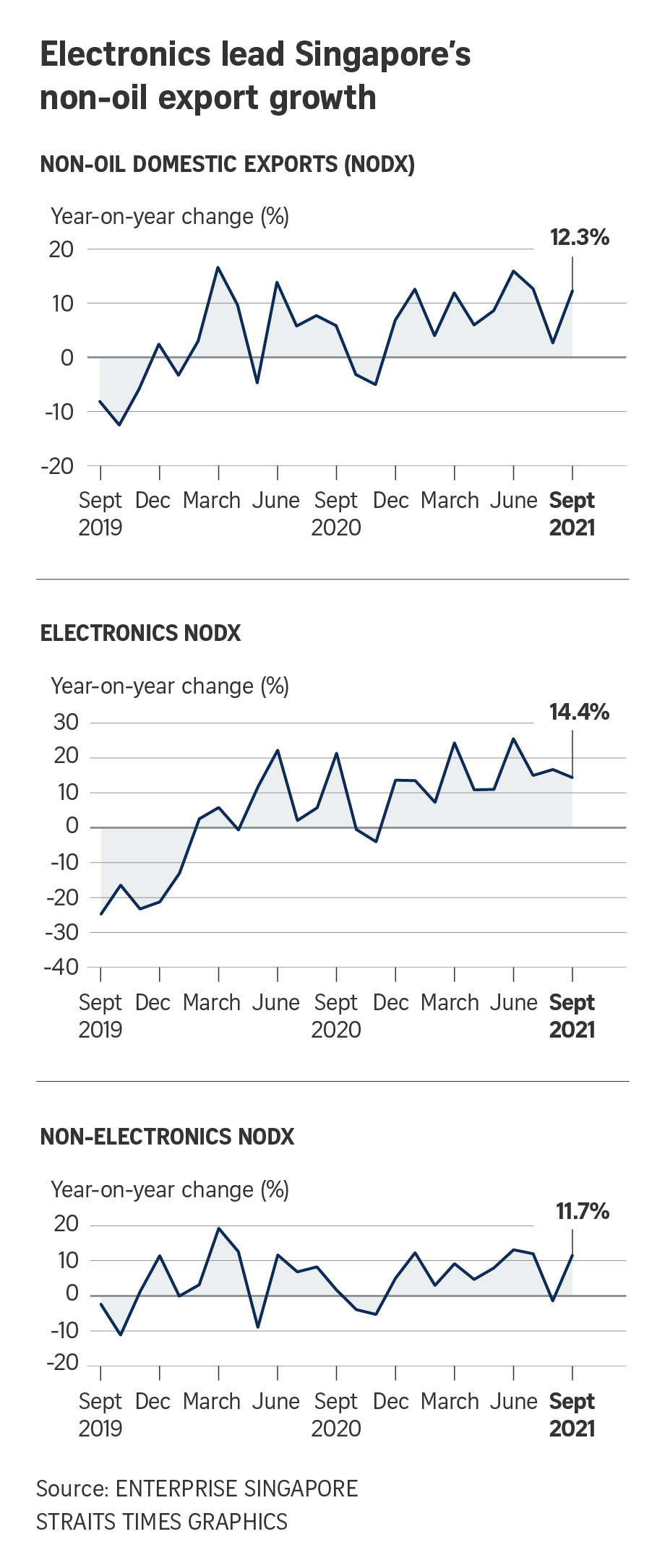 SINGAPORE - Singapore's non-oil domestic exports (Nodx) expanded at a faster pace last month from August, helped by growth in both electronics and non-electronics shipments that defied concerns over supply chain disruption and the slowing growth in top trade partner China.
