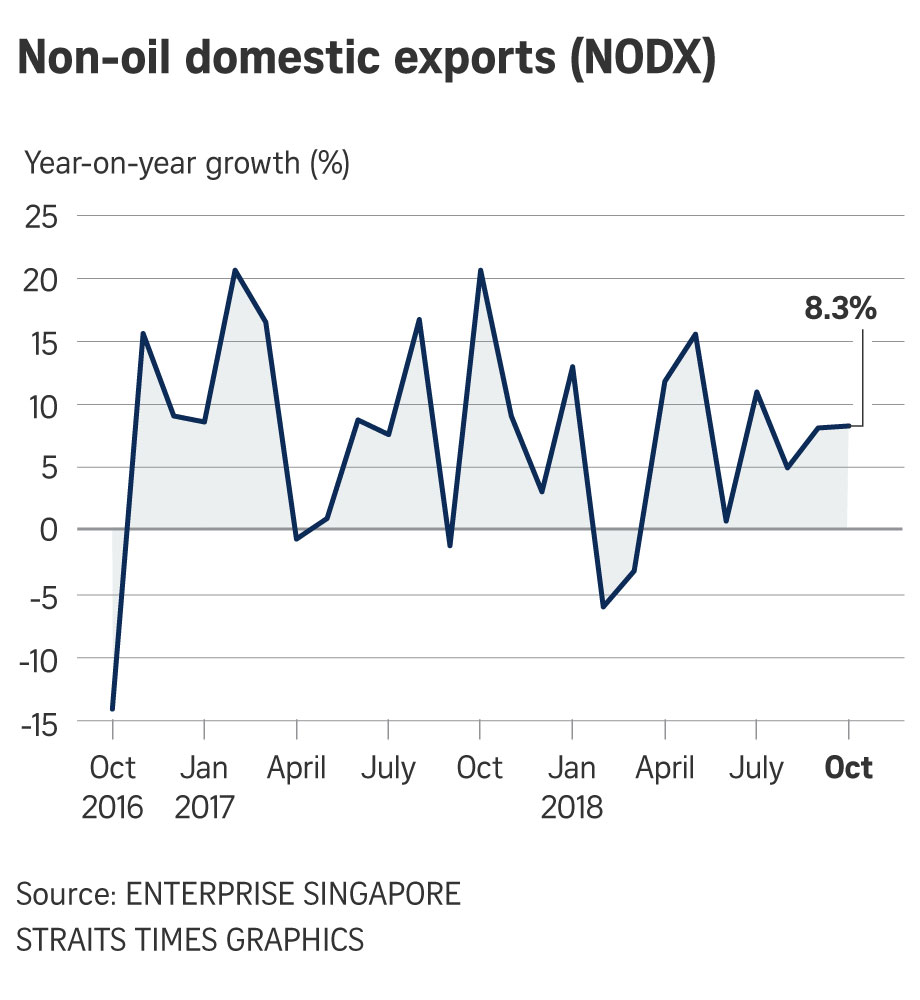 SINGAPORE - Singapore's non-oil domestic exports (NODX) jumped 8.3 per cent in October over a year ago, extending September's 8.1 per cent rise - thanks to an increase in non-electronic NODX which outweighed a continued dip in electronic domestic exports.