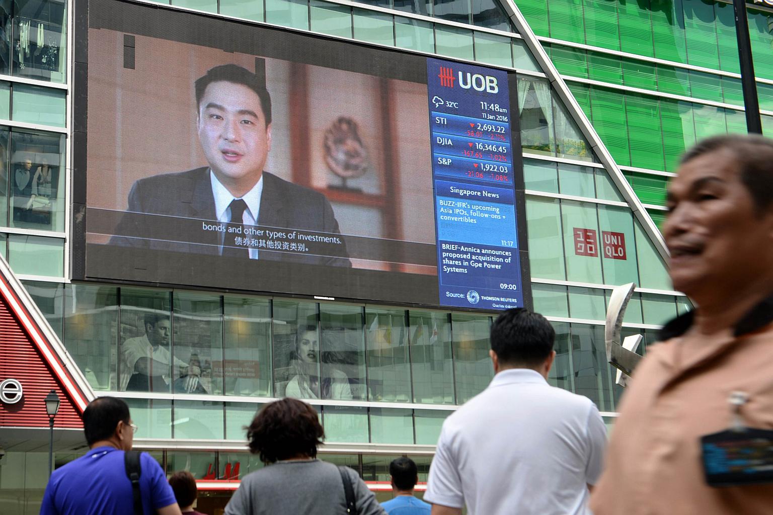 A big screen displays information on the stock index at the Raffles Place financial district on Jan 11, 2016.