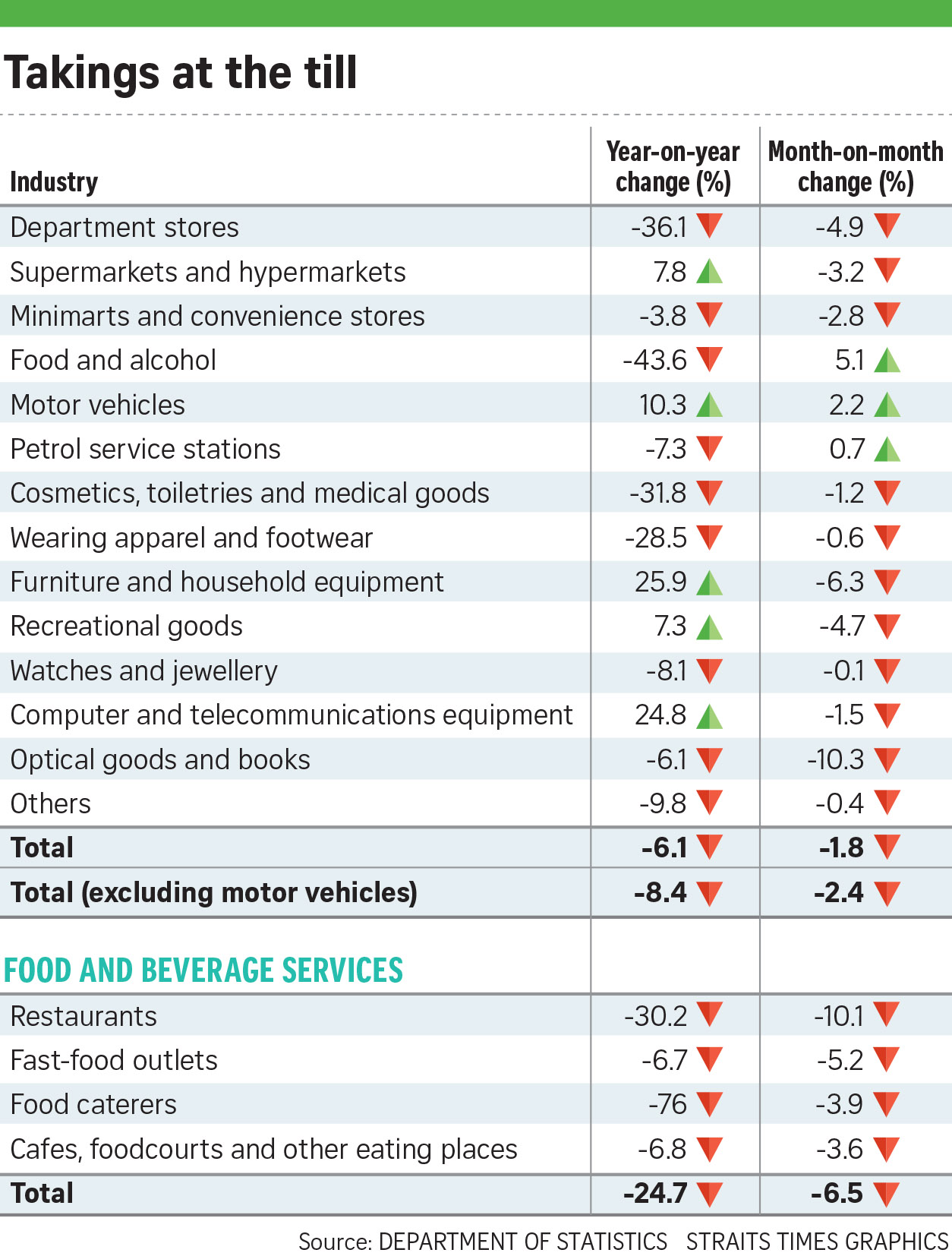 The slump in takings was led by food and alcohol, where sales sank 43.6 per cent, followed by department stores at 36.1 per cent and cosmetics, toiletries and medical goods at 31.8 per cent.