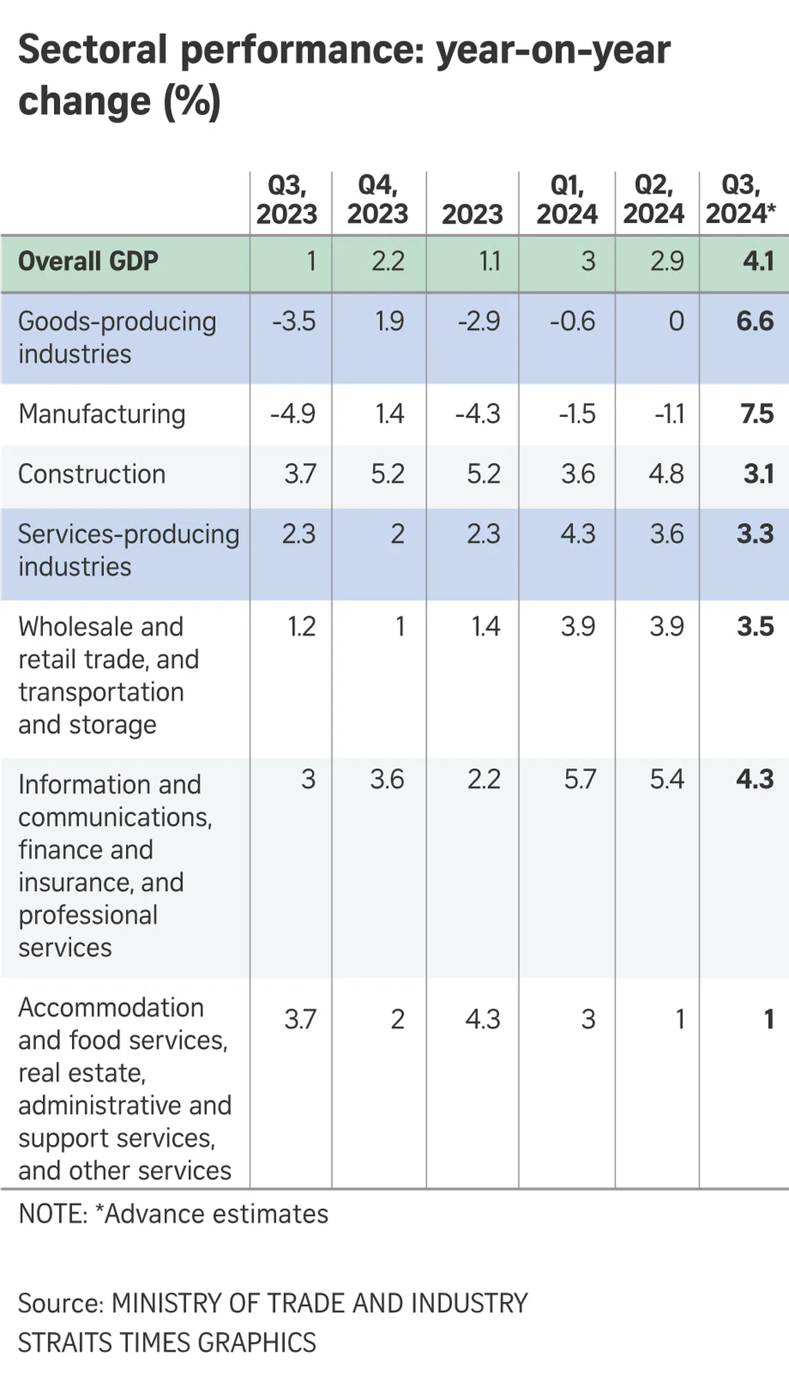 The sector expanded by 7.5 per cent year on year in the third quarter, after contracting 1.1 per cent in the previous quarter. The growth was led by output expansions across all manufacturing clusters, except for biomedical manufacturing.