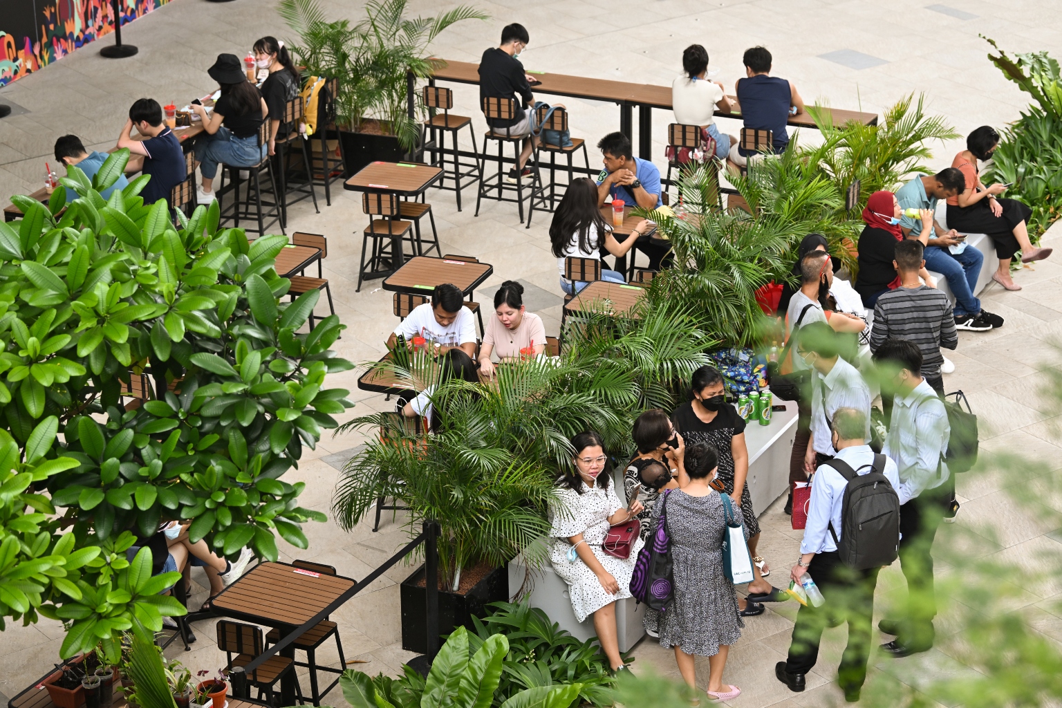 People dining and socialising outside PLQ Mall in Paya Lebar on a Sunday earlier this month.