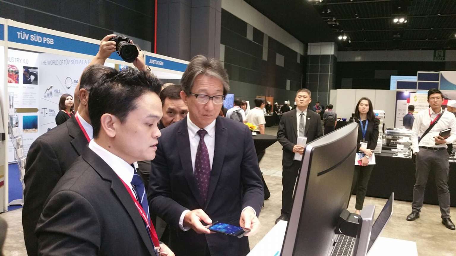 Minister Lim Swee Say looking at HP's enterprise solution during the Singapore Productivity Conference and Exhibition.