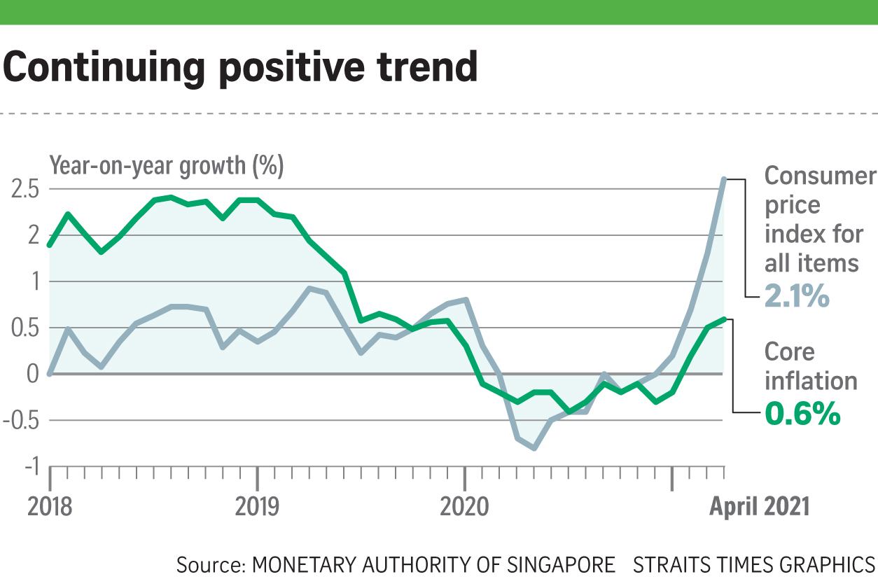 "But we do not expect the impact on prices to be as significant as the second quarter of last year, when... global demand collapsed. The United States, United Kingdom and Europe are reopening, which could fan global commodity prices," added Dr Chua and Ms Lee, who expect overall inflation to come in at 1.3 per cent and core inflation at 0.9 per cent this year.