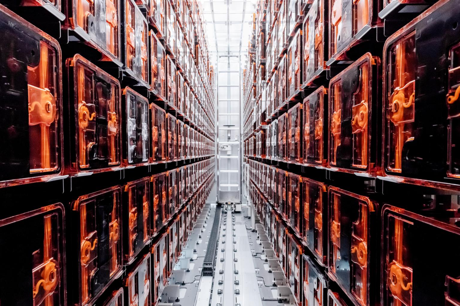 An automated stocker system in Soitec's Singapore facility, which stores wafers and is at full capacity.