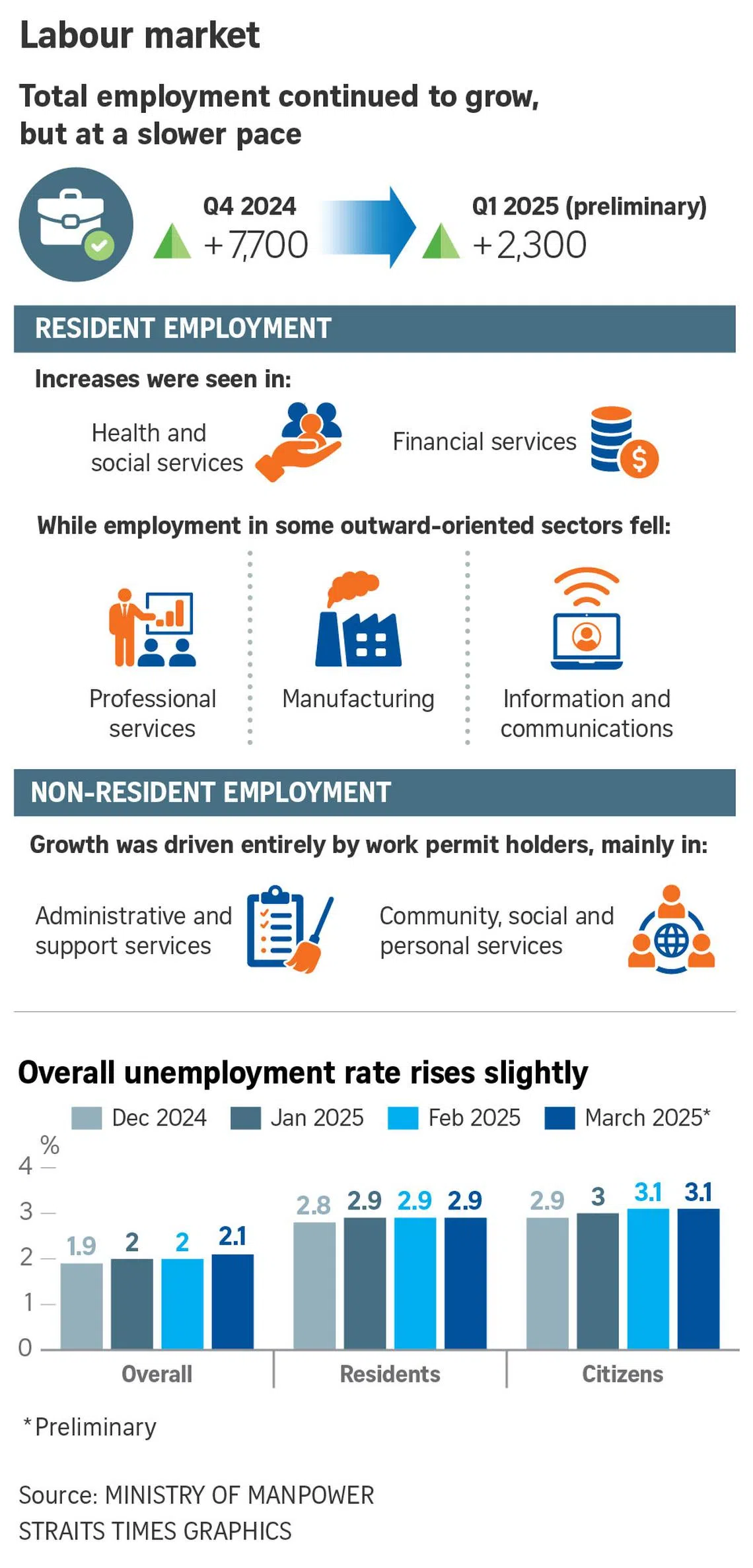SINGAPORE – The unemployment rate in Singapore ticked up slightly in the first quarter of 2025, with employment growth slowing as escalating global trade tensions put a dent on business sentiment.