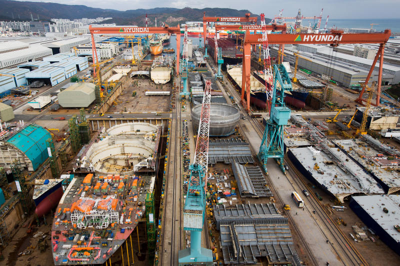 Ships stand under construction in the dry dock at the Hyundai Heavy Industries Co shipyard in Ulsan, South Korea.