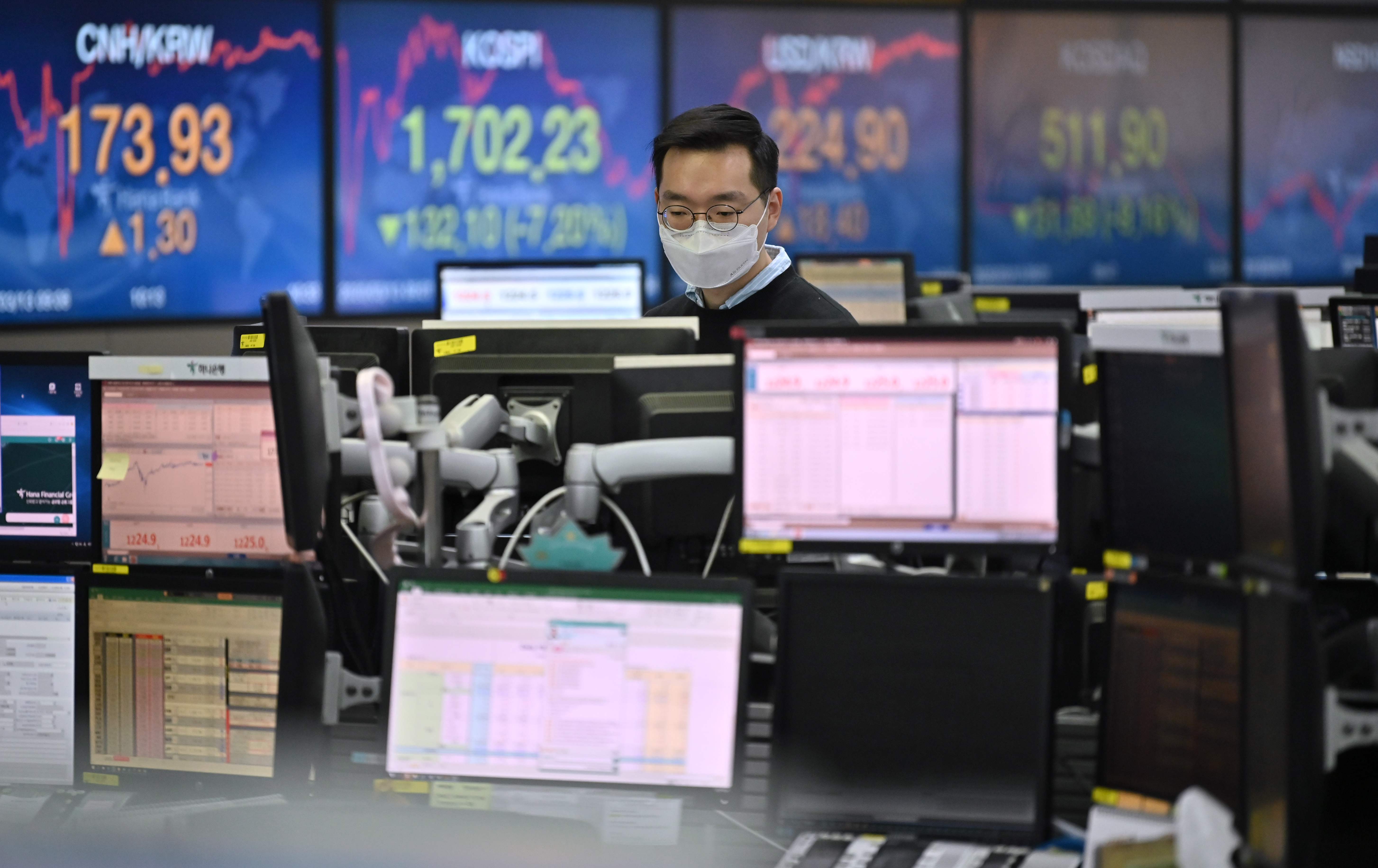 A currency dealer wearing a face mask monitors exchange rates in a trading room at KEB Hana Bank in Seoul, on March 13, 2020.