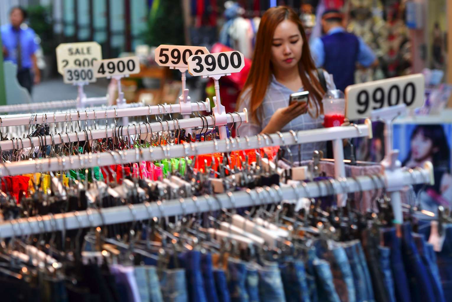 A woman walks past clothing displayed by various prices at a shopping district in Seoul on July 26, 2016.