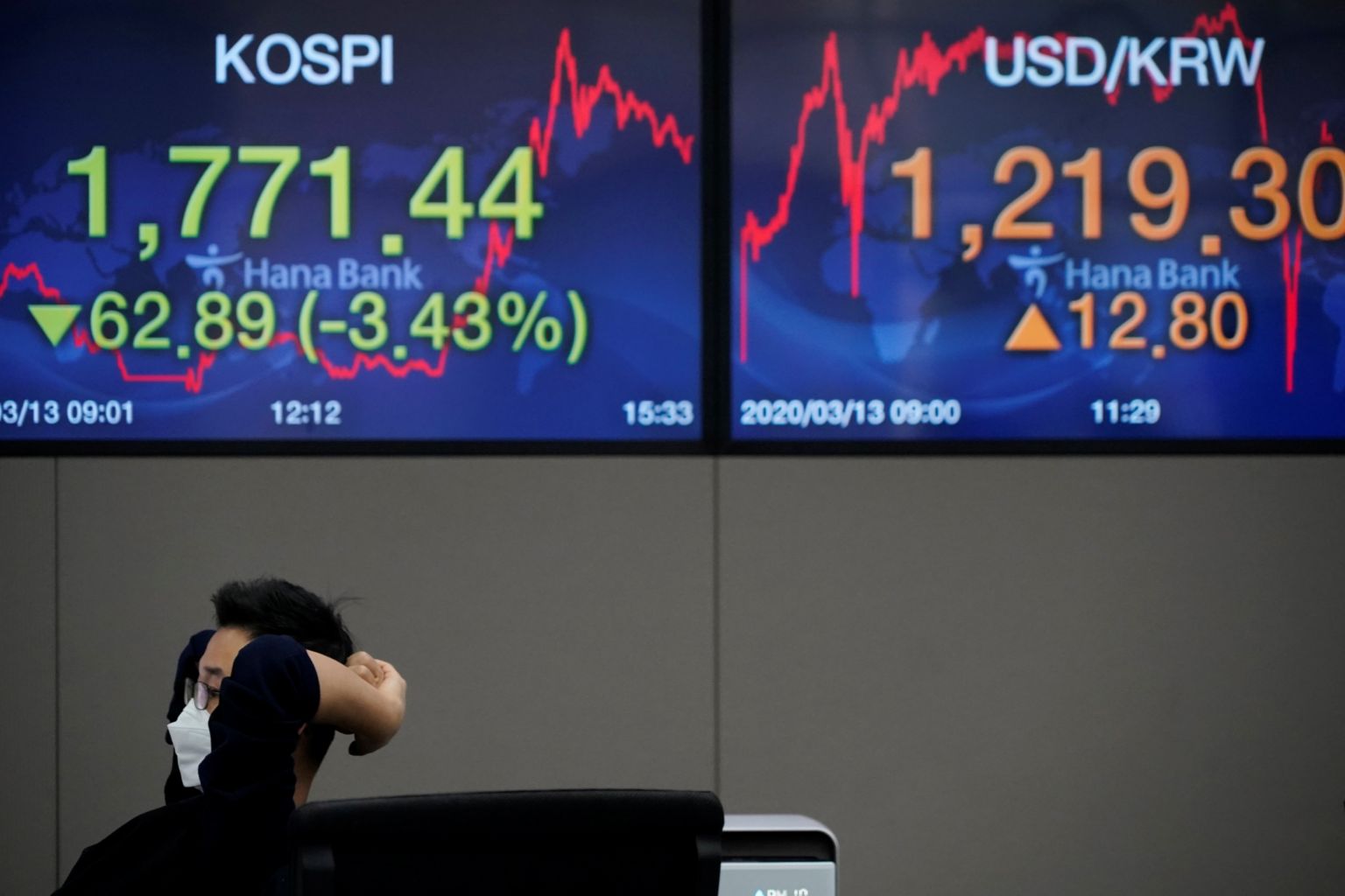 A currency dealer sits at a dealing room of a bank in Seoul, South Korea, on March 13, 2020.